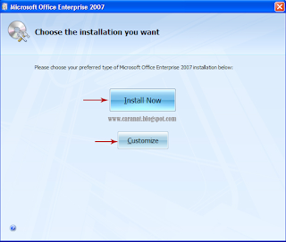 4. Selanjutnya muncul tampilan yang memberikan pilihan instalasi Microsoft Office 2007, yakni Install Now dan Customize, dengan ketentuan sebagai berikut :
